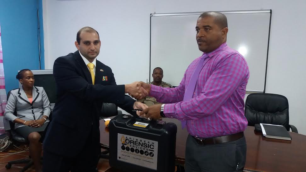 During a ceremony at the Royal St. Lucia Police Force’s Headquarters on January 18, 2016 a ‘Forensic Latent Fingerprint Kit’ was handed over to St. Lucia’s Acting Commissioner of Police Errol Alexander and his crime scene experts by Dr. Maurice Aboud, Chief Forensic & Criminalistic Officer at ASSL and Lab Director at Caribbean Forensic Services Limited. Commissioner Alexander highlighted that the ‘Forensic Latent Fingerprint Kit’ was specifically selected by RSLPF’s experts to complement the current crime scene armoury. St. Lucia’s ACP Crime Milton Desir stated that there is no doubt that this vital tool will enhance the crime scene investigative capabilities of the Royal Saint Lucia Police Force. Dr. Aboud affirmed that this kit will be useful indeed to collect evidence in a manner in which such evidence can be upheld in court and lead to conviction. (In St. Lucia ASSL operates as ‘Alternative Security Services Limited’.)