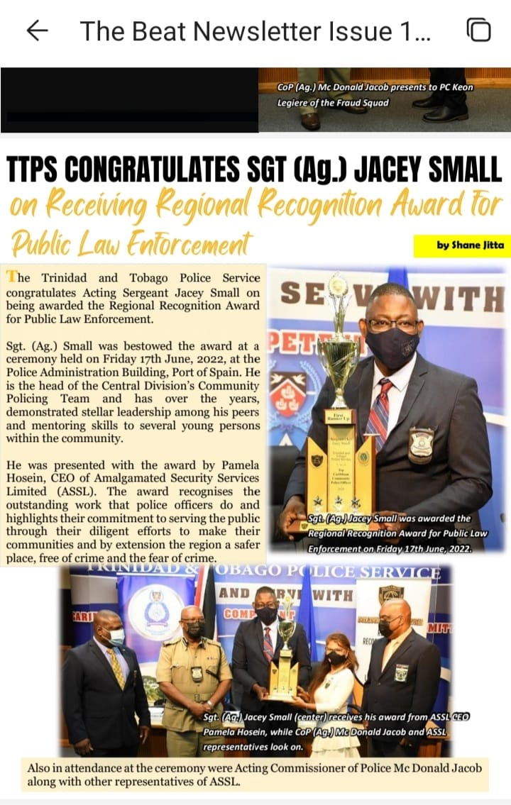 Today we congratulate the Trinidad and Tobago Police Service and more specifically Mr. Jacey Small in achieving the award of 1st Runner Up in the category of Top Community Policing Officer for the year 2020.
